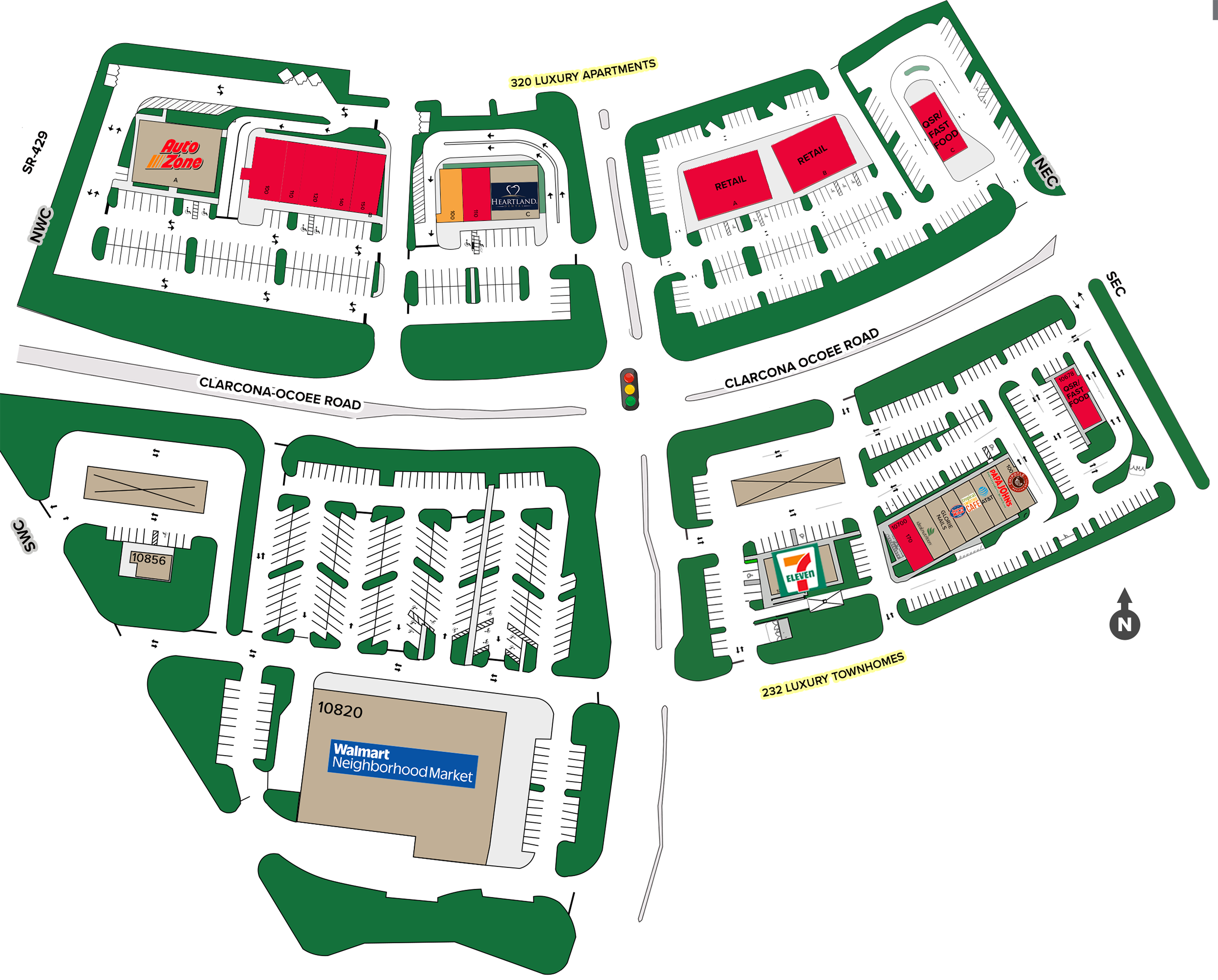 Ocoee Village Center is a new retail development project. The center will include the four corners at SR-429 and Clarcona-Ocoee Road and will feature a Walmart Neighborhood Market with a gas station, a 7-Eleven convenience store with gas, Chipotle, Papa Johns, AT&T, Tropical Smoothie Café, Jersey Mike’s, Glorie Nails, Ideal Nutrition, AutoZone, Heartland Dental, along with other restaurants and retail stores. As part of a larger planned development, Ocoee Village Center will include 320 luxury apartments and 232 townhomes. The center is highly visible, with 64,000 vehicles per day on SR-429 and 19,000 vehicles per day on Clarcona-Ocoee Road, and traffic will continue to grow within this emerging community.