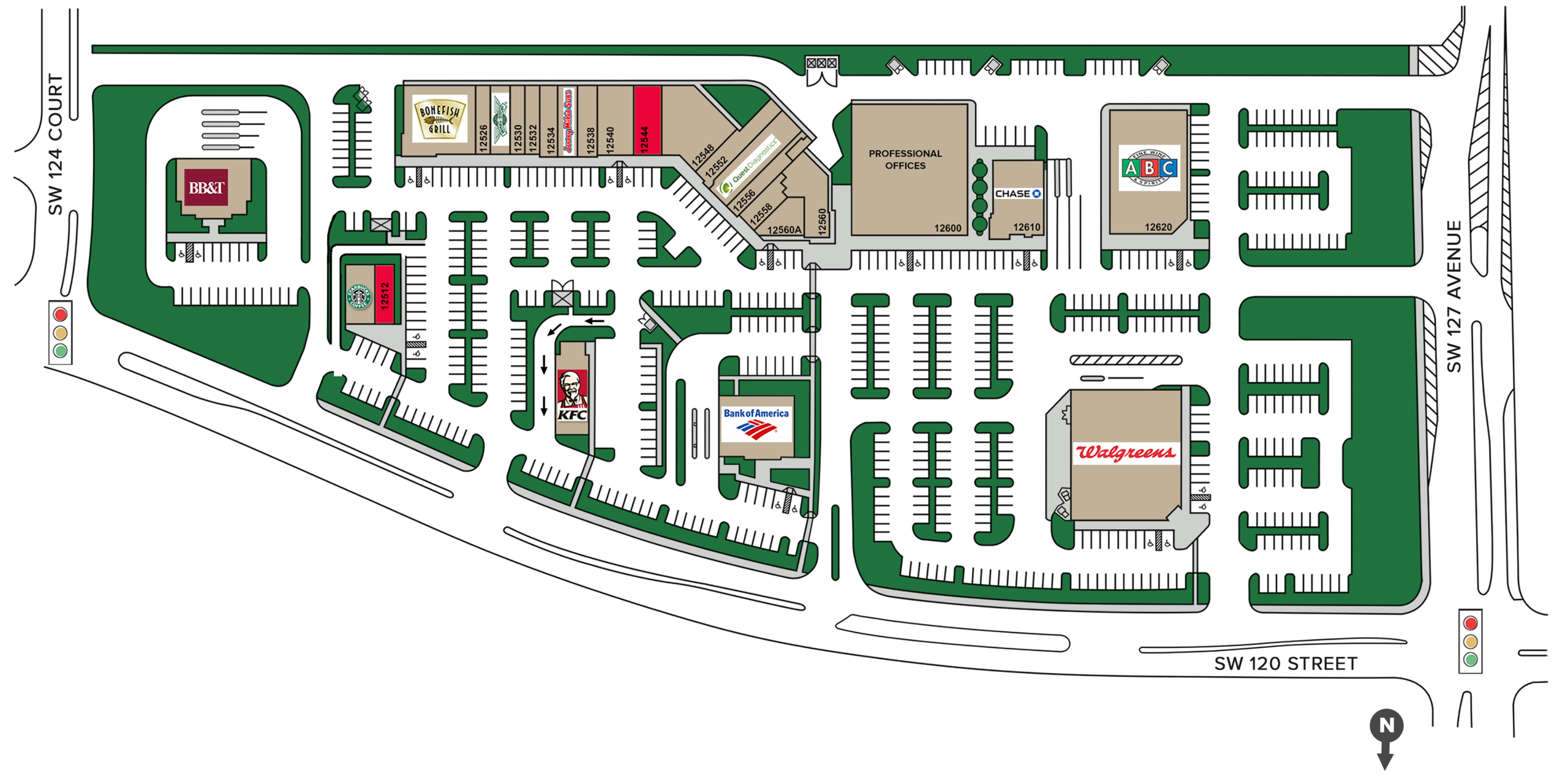 This 110,000 square foot shopping center and office building is located at the corner of SW 120th Street and SW 127th Avenue in Kendall in a high traffic area. It is located less than one mile west of a Florida Turnpike exit and directly across from a 61,000 sf Publix shopping center. Current tenants include Bonefish Grill, Walgreens, ABC Fine Wine & Spirits, Wing Stop, Starbucks, Robeks, Bank of America, Chase and KFC. This prime location enjoys AADT traffic counts of over 53,000 at the intersection.