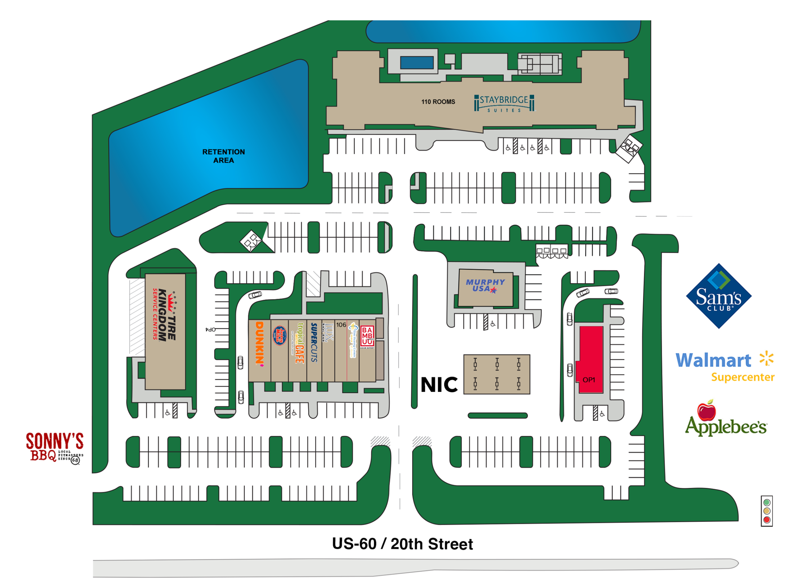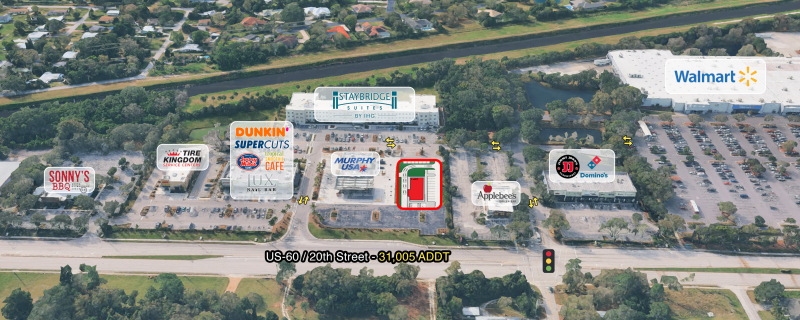 This outparcel is adjacent to Vero Beach Square, a new community shopping center in the area’s major retail corridor along State Road 60. This location offers cross access with Walmart Supercenter, Sam’s Club and 58th Avenue and shares a traffic light at 53rd Avenue. Located in the area’s major retail hub which includes Indian River Mall and multiple power centers. Join these national tenants: Staybridge Suites, Murphy USA, Tire Kingdom, SuperCuts, Tropical Smoothie Café and Dunkin’.